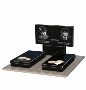 - Устройство: с постаментом , со стелой , с гробницей , полное полирование сторон , неполированные фаски , с противоусадочной плитой , 2 портрета, ФИО с одной фамилией и даты