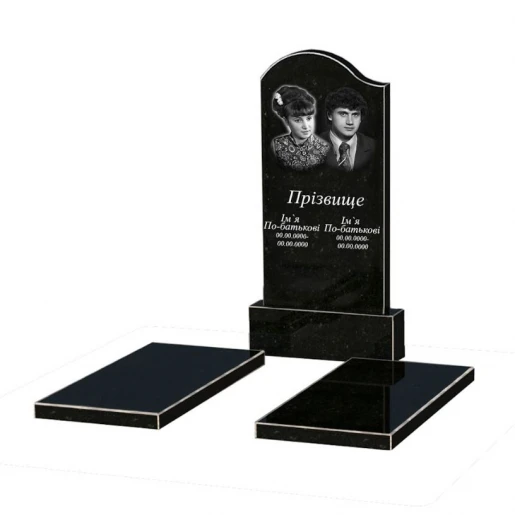 - Влаштування: з постаментом , зі стелою , без майданчика , з надгробною плитою , повне полірування сторін , неполіровані фаски , 2 портрети, ПІБ з одним прізвищем та дати